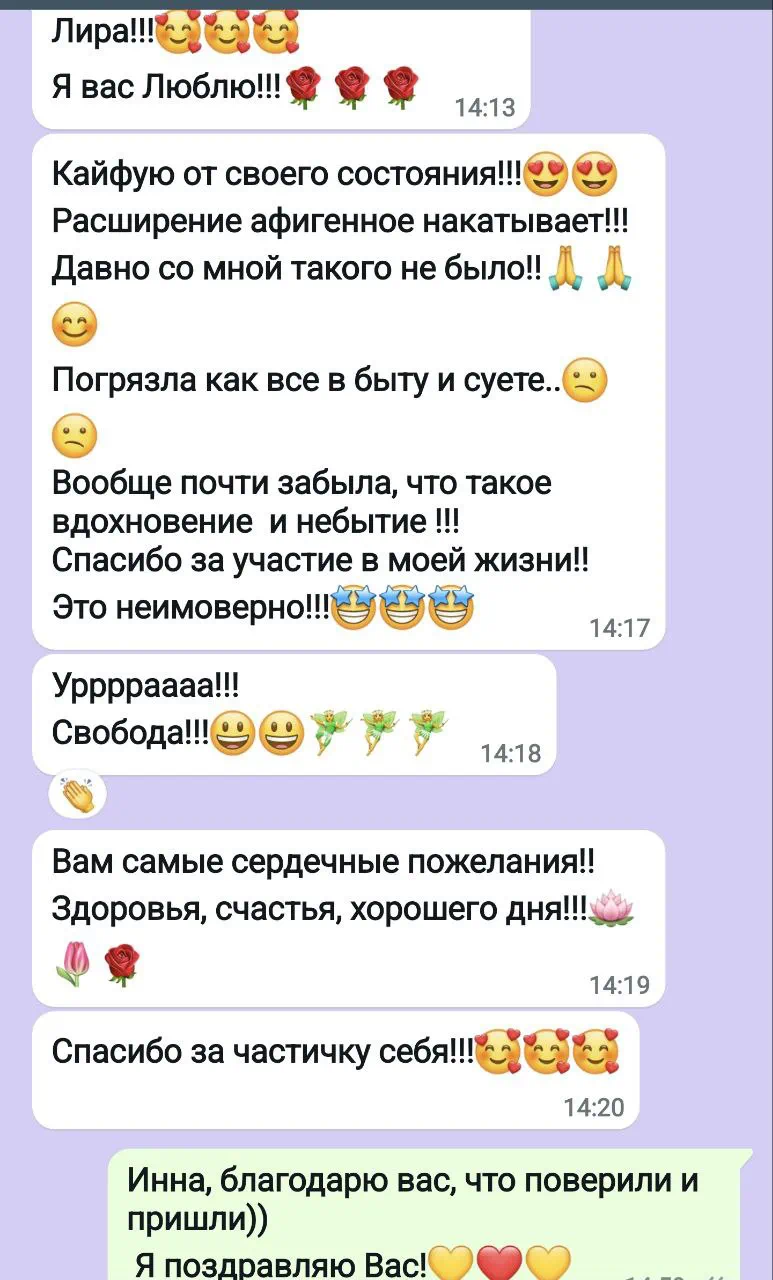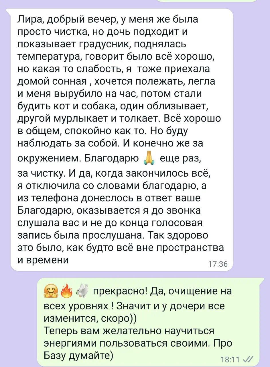 Можно провести аналогию с хирургией. Мои действия это бесконтактное операционное вмешательство на матричном уровне. В основном направленная на перезапись деструктивных программ и восстановление исходного, здорового состояния психофизиологической и родовой систем.