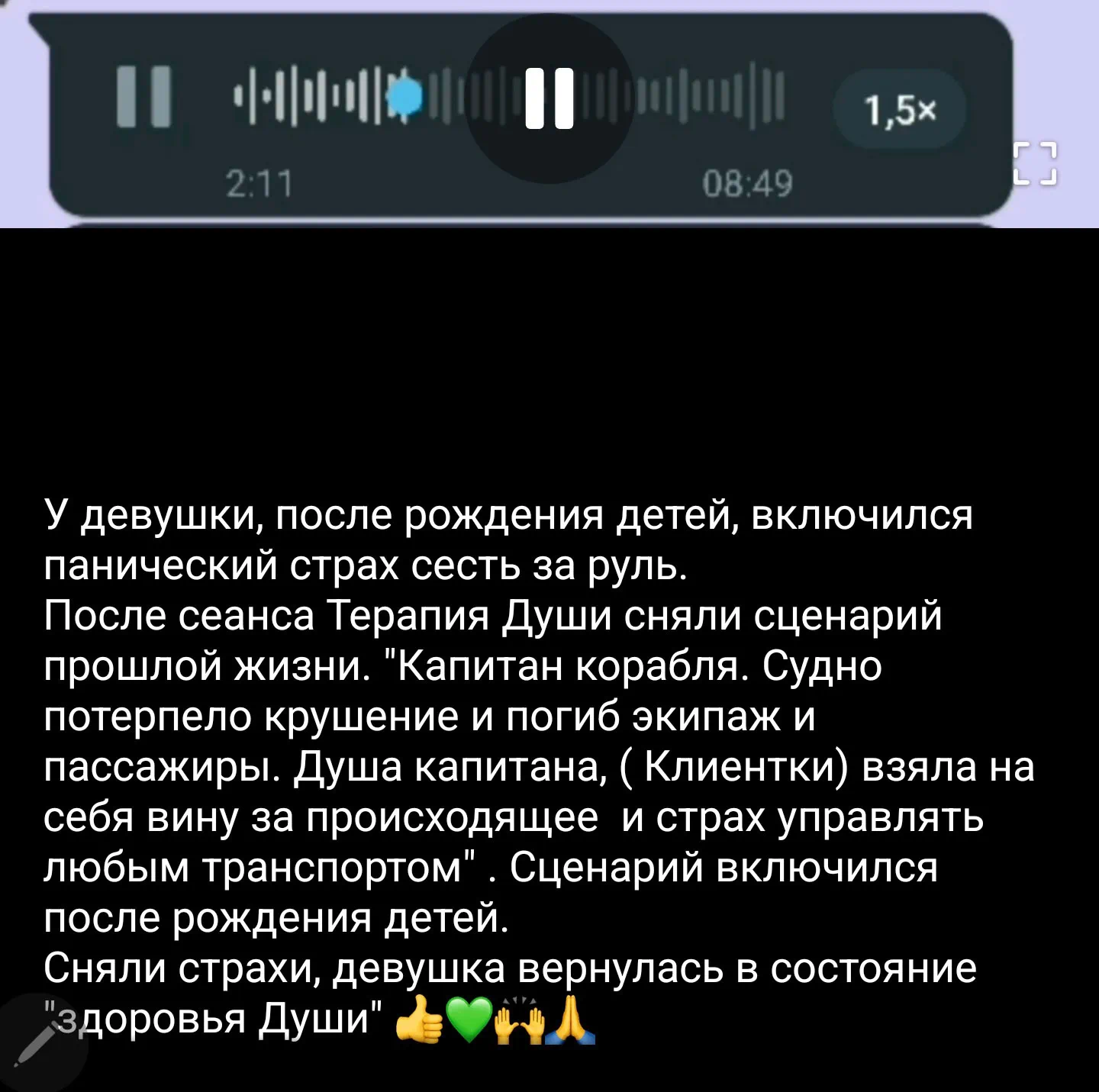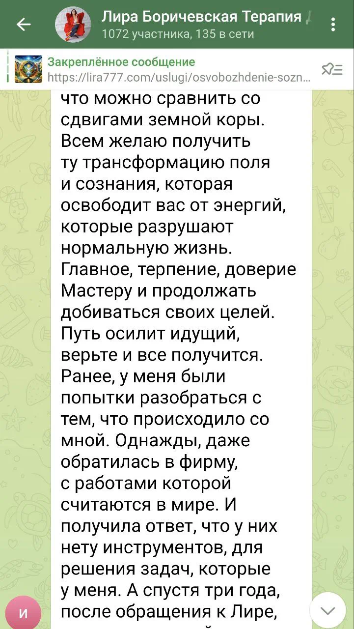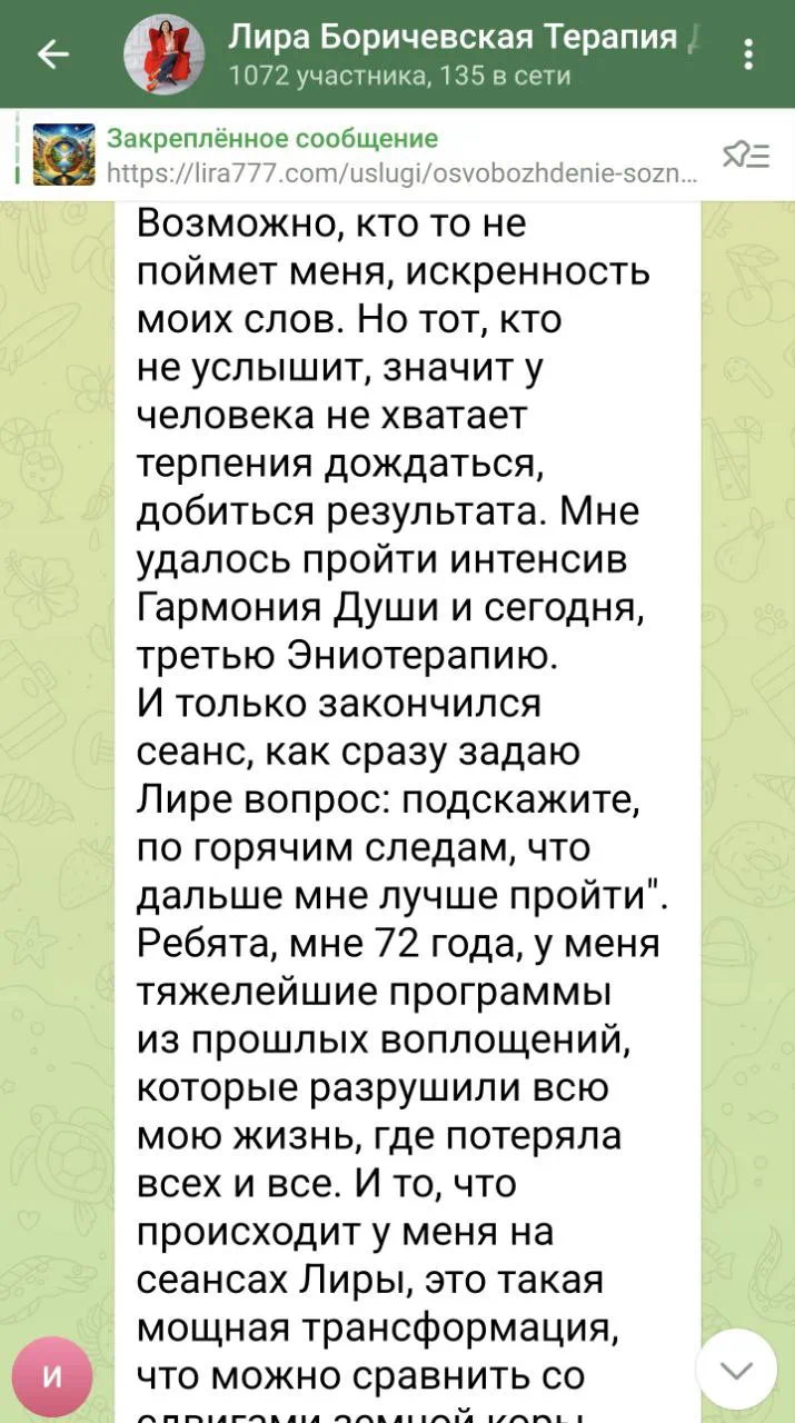 Существует настоящая интерпретация «прошлых» событий, которая формирует наше сегодняшнее состояние. Я работаю с глубинными памятными следами в энергоинформационной структуре человека, изменяя их эмоциональный заряд и смысловую нагрузку, что кардинально меняет их влияние на «настоящее».
