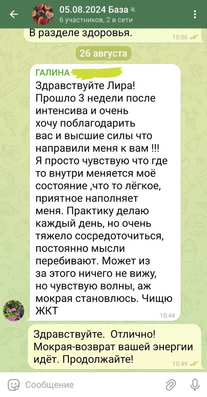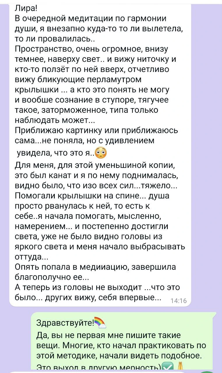 Однажды, после просмотра фильма «Лекарь» я сделал запрос во вселенную послать мне мастера, кто поможет мне в моей ситуации. Спустя некоторое время я встретила мастера, который не имел специального обучающего руководства, а просто работал со мной на тонком плане. За 4 года нашего взаимодействия я научилась наблюдать за ее творением. Пробовала сама, ежедневные, многочасовые практические сессии с самой собой постепенно давали результаты.