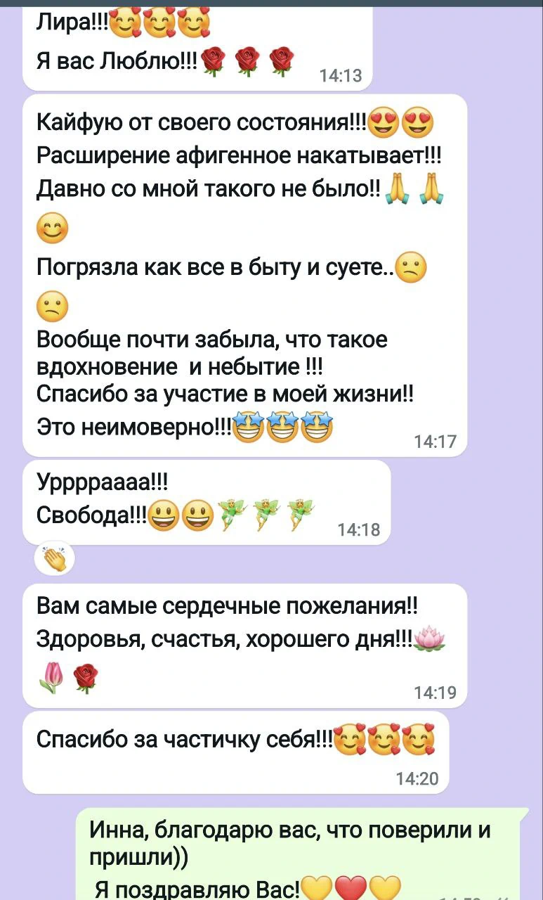 Тогда я начала углубляться и знакомиться с мирозданием. Спустя 13 лет, пройдя массу тренингов, семинаров, школ, тонкоматериальных ощущений через расстановки, регрессы, гипнозы, которые на меня никогда не действовали с детства, я поняла, что все ничтожно и тщетно.